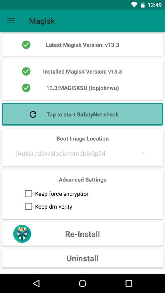 To ensure that your phone still passes Google’s SafetyNet check, open the Magisk Manager app and tap the “Tap to Start SafetyNet Check” button. If your device passes the SafetyNet, two additional green checkmarks will appear in the SafetyNet Check Status.